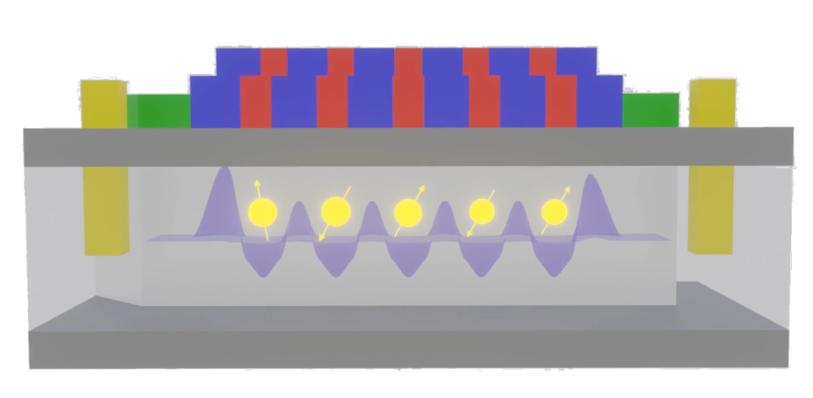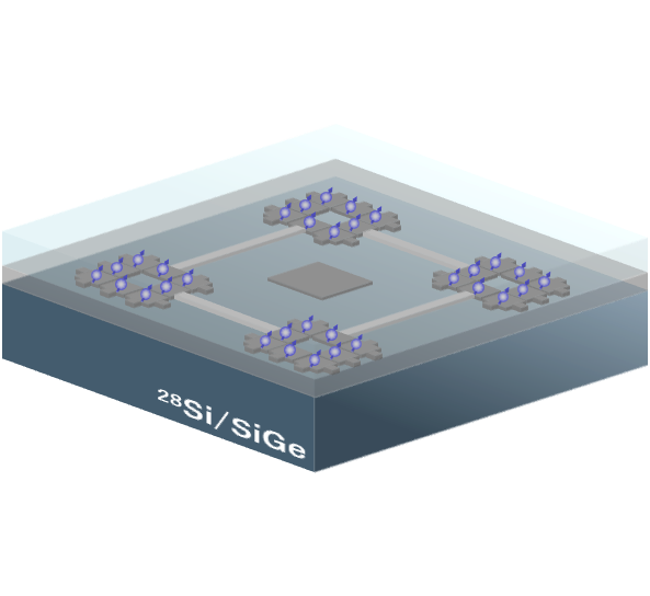 シリコン/シリコンゲルマニウム(Si/SiGe)の高品質基板を用いて拡張性のある多量子ビットデバイスの作製技術を開発し、小〜中規模量子コンピュータのプロトタイプを実装します。