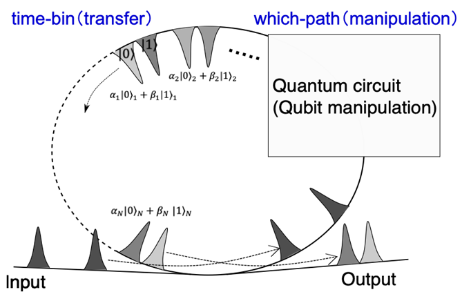 量子ビットを電子波束の量子状態で定義し、量子演算回路を設置したループ回路において、電子波束を繰り返し伝搬させることによってユニバーサルな量子演算を実行します。この手法では、冷凍機1台で実現する小さなハードウェアで、実用的な大規模量子コンピューターを構成できる可能性があります。